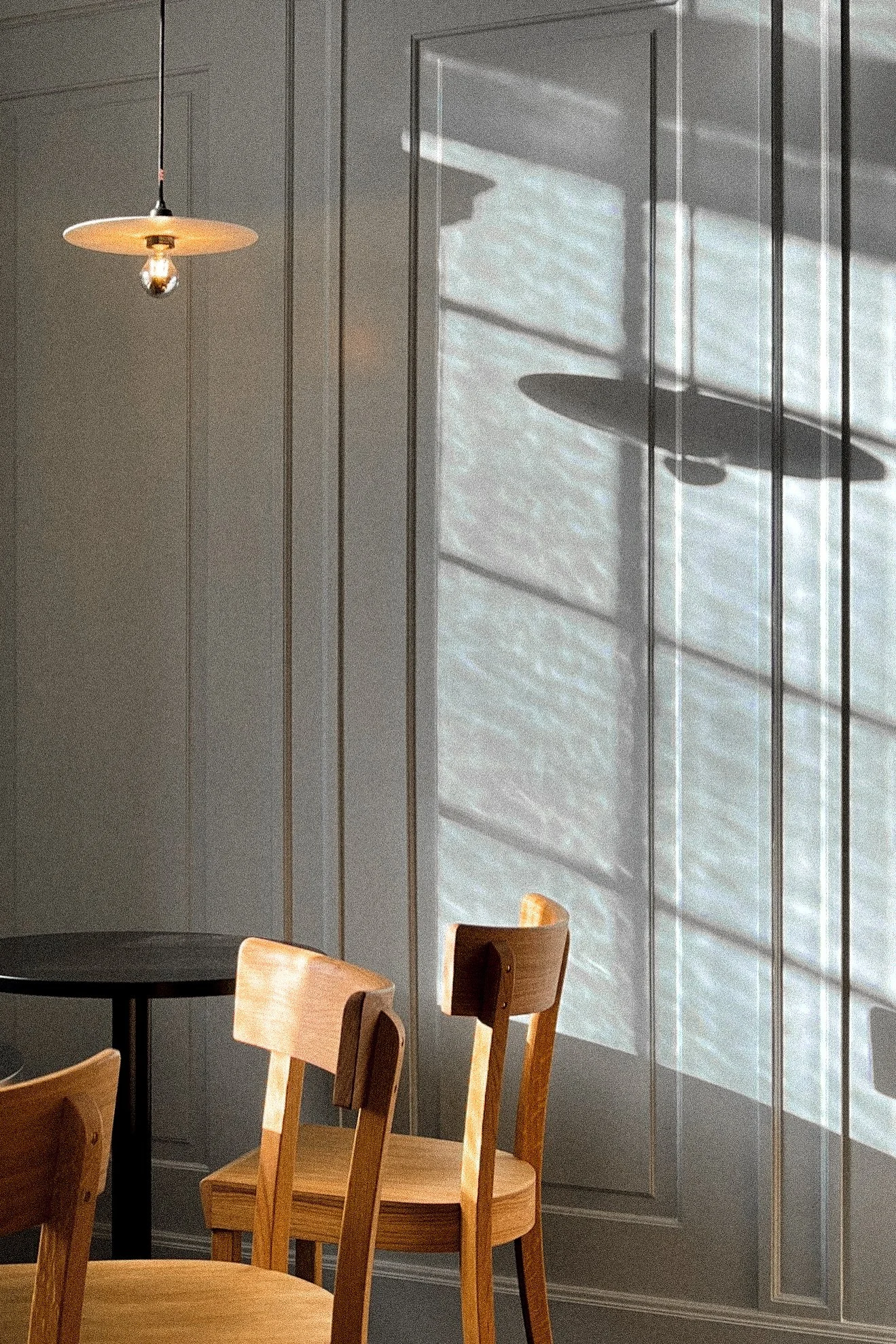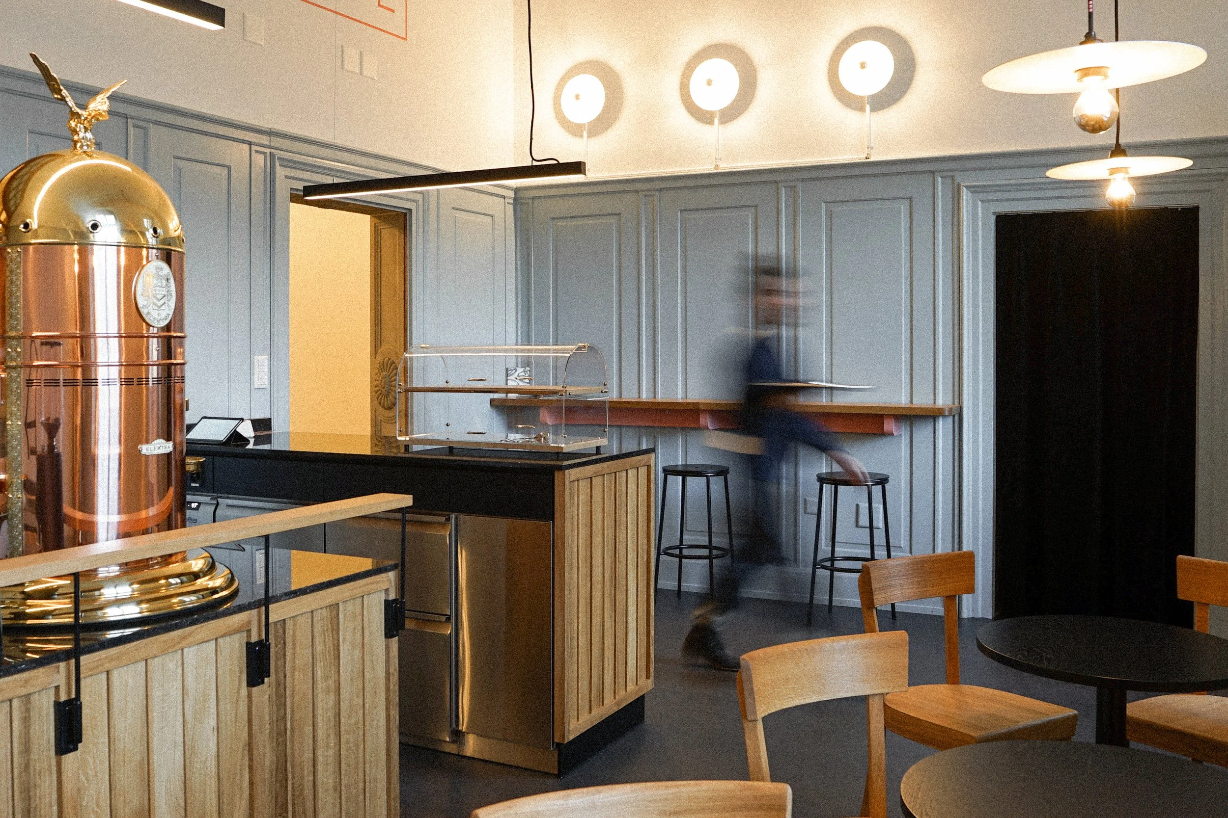 Ein hauseigenes Café direkt am Stadtpark – ein grosser Traum für den Museumsdirektor Dr. Peter Fux. Das MuCafé vermittelt zwischen dem Foyer und der ausladenden Terrasse mit Blick ins Grüne. Die Durchreiche zum Foyer wird umrahmt von einer filigranen Holzkonstruktion, die erste Einblicke gewährt und bei Sonnenschein für ein Lichtspiel sorgt. Der schwarze Marmor wird aus dem Bestand übernommen und prägt mit dem Eichenholz das Interieur. Das Hellblau des Täfers fasst den Raum sanft ein und bringt die gewünschte Fröhlichkeit hinein.